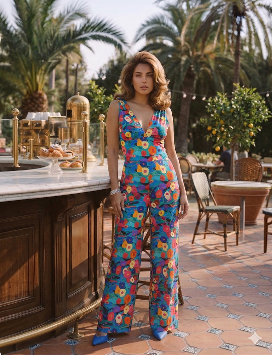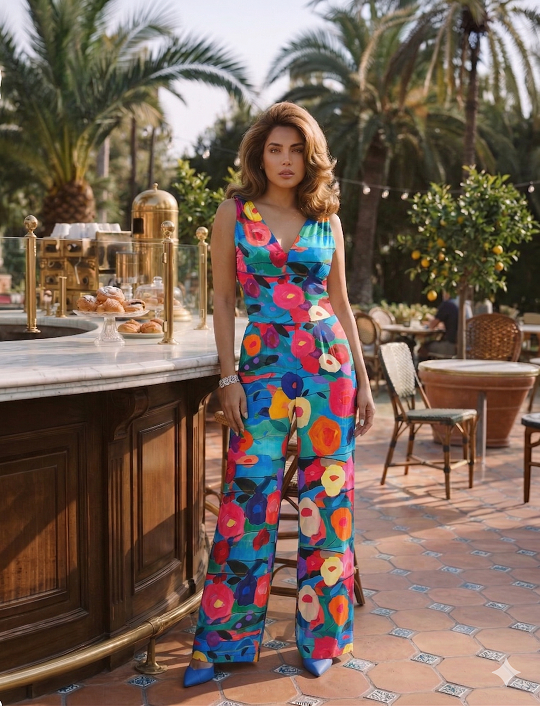 A sleeveless jumpsuit featuring a V-neckline, available in different prints