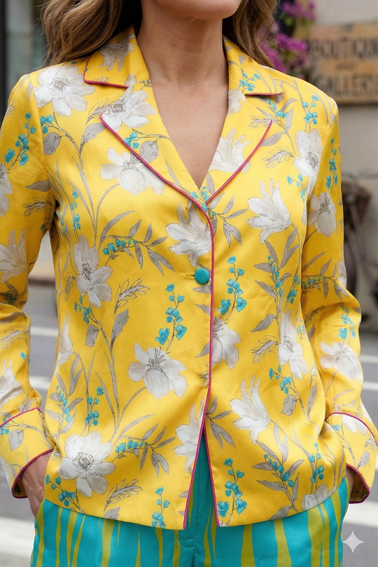 A tailored blazer with a delicate botanical print, along with the lapels and cuff.